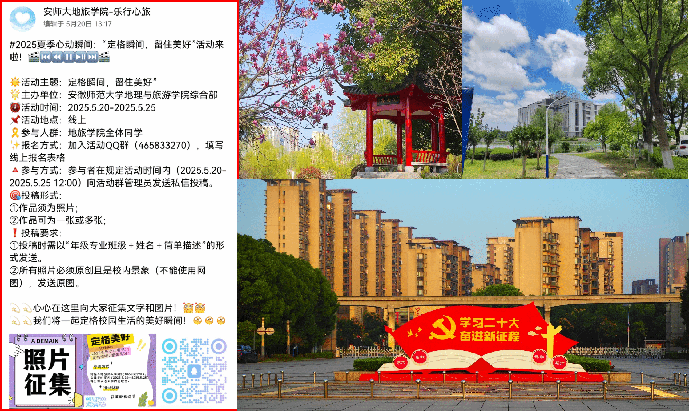 “乐行心旅”心理发展辅导站面向全院学生举办了以“2025夏季心动瞬间:定格瞬间,留住美好”为主题的摄影比赛活动,极大调动了同学们关注身边美好事物的积极性,让同学们在繁忙的课业之外,感受随处可见的小美好,养成积极健康的心理状态和生活态度,活动得到了同学们的踊跃参加和充分肯定。