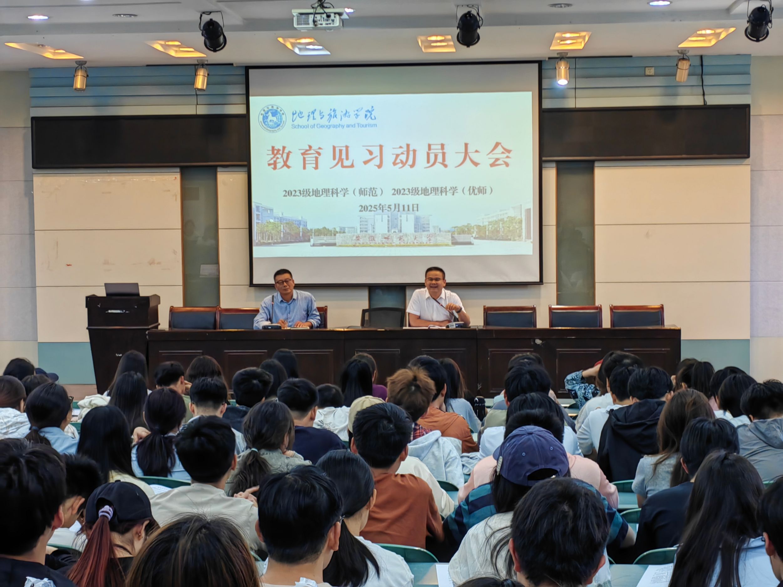 在学院实验楼101报告厅举行教育见习动员大会,学院党委副书记付勇、地理科学专业负责人朱永恒、校内指导教师、辅导员以及全体教育见习学生参加会议。会上,付勇代表学院进行动员讲话,希望同学们转变身份、端正见习态度,调整心态、提高适应能力,重视安全、守住安全底线,见习期间服从教学管理和纪律要求,强化团队合作和集体协作,不断提高凝聚力、向心力、战斗力,以实际行动展示师大学子的良好风貌和青春风采。朱永恒全面解读了教育见习的目的、内容和要求,表示教育见习是地理科学专业师范生重要的教育实践课程,是同学们体验师德情怀、培育专业精神不可或缺的重要环节,希望大家认真向一线教师求教,求真学问、练真本领,全面提升专业技能。
