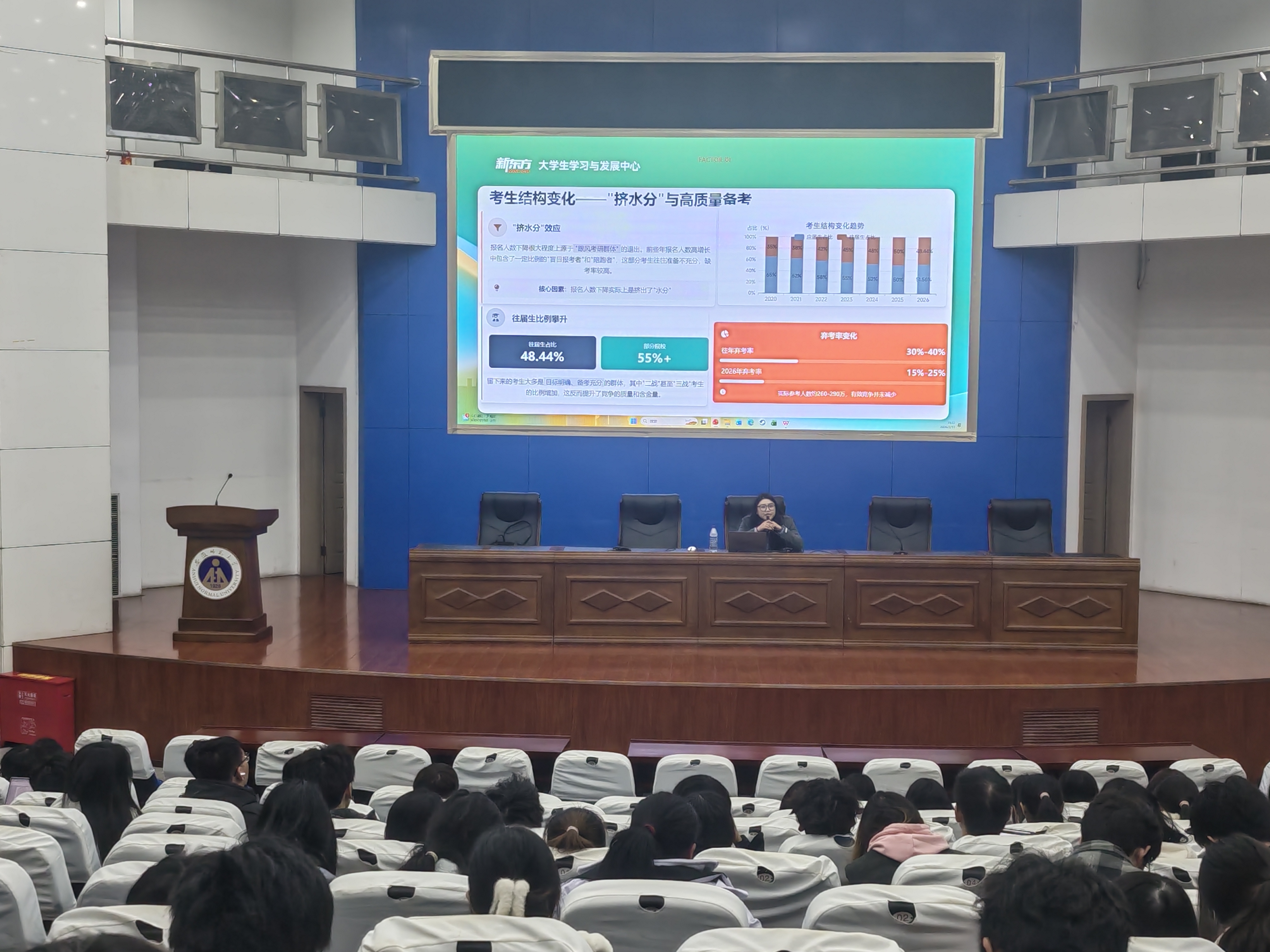 新东方教育集团考研项目金牌讲师、全国金牌院校规划师、新东方合肥中心考研规划负责人彭利平应邀讲授“考研规划”专题讲座,并从政策分析、详实数据、典型案例、备考策略等各方面,为同学们全面系统深入讲解了“何为考研”“为何考研”“如何考研”基础性问题,有效回答了同学们当前阶段关于考研的迷茫和困惑。