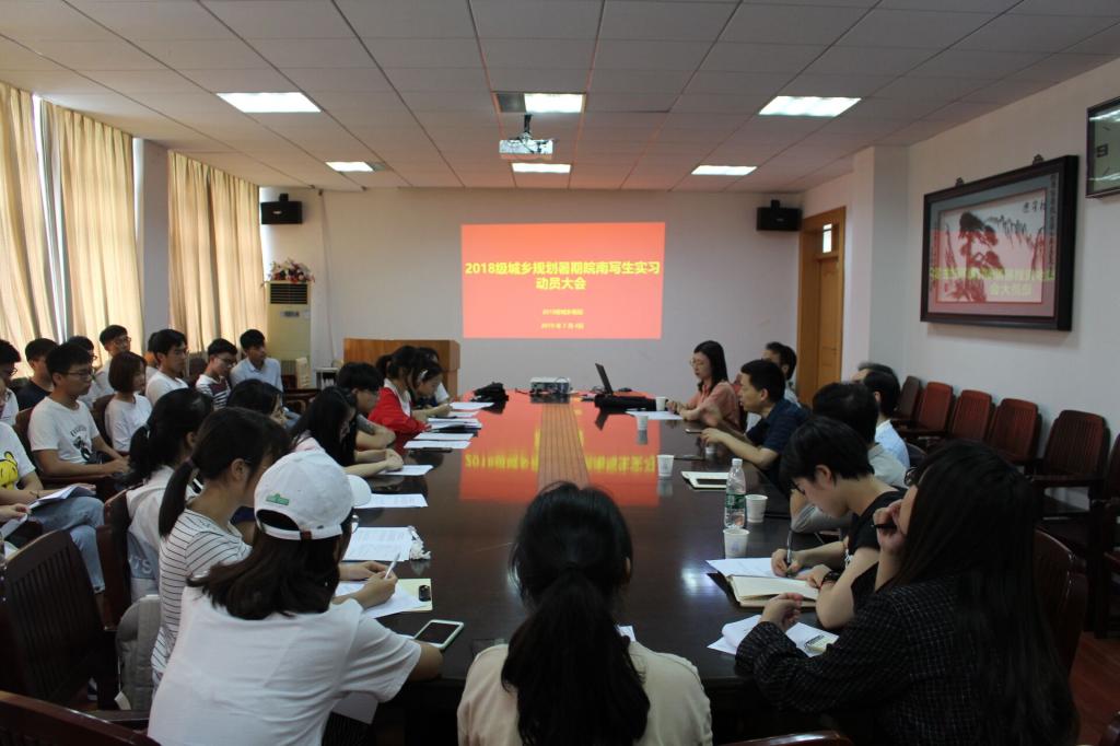 三楼会议室召开2018级城乡规划暑期皖南写生实习动员大会。会议由带队老师黄秋实主持,副院长曹卫东,院党委副书记乔静,城乡规划系主任杨兴柱,城乡规划专业课教师张晨阳,辅导员王阳及2018级城规全体同学参加会议。