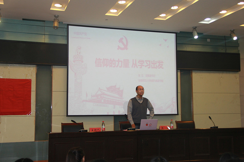 校学生处处长刘晓宇做《入党誓词与党员责任》专题课程。他以“不同时期不同入党誓词”作为导入,围绕入党誓词的沿革与释义,用一个又一个生动鲜活的案例,向同学们一次又一次的阐释了共产党员的责任与义务。