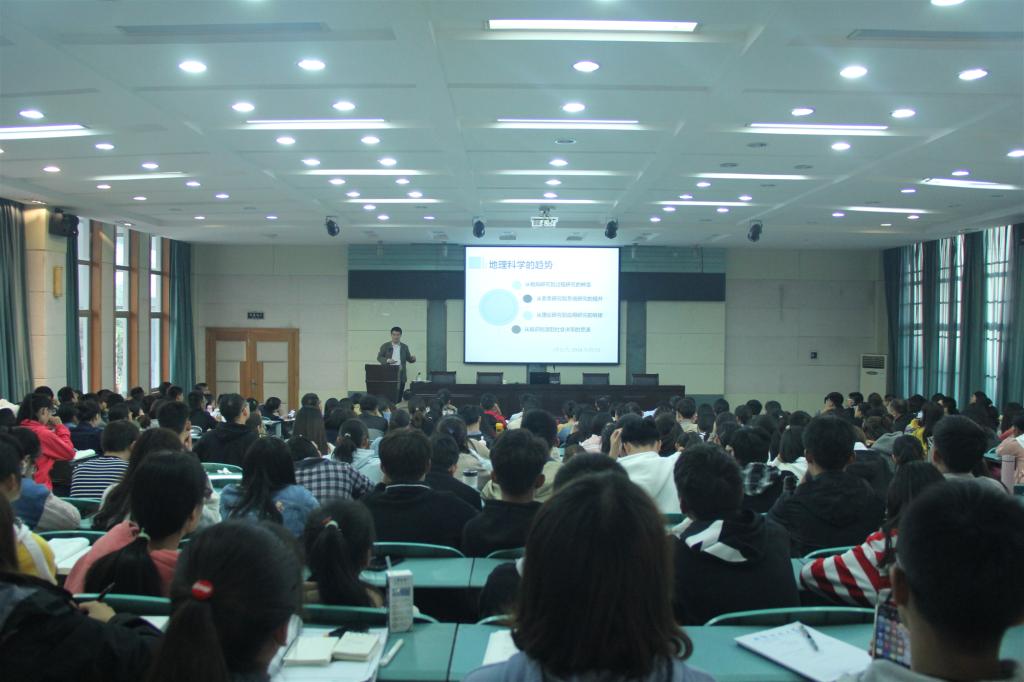 党委书记贾冠忠,相关专业教师,部分专业研究生和2019级地理科学大类全体新生聆听了报告。报告由竞彩网