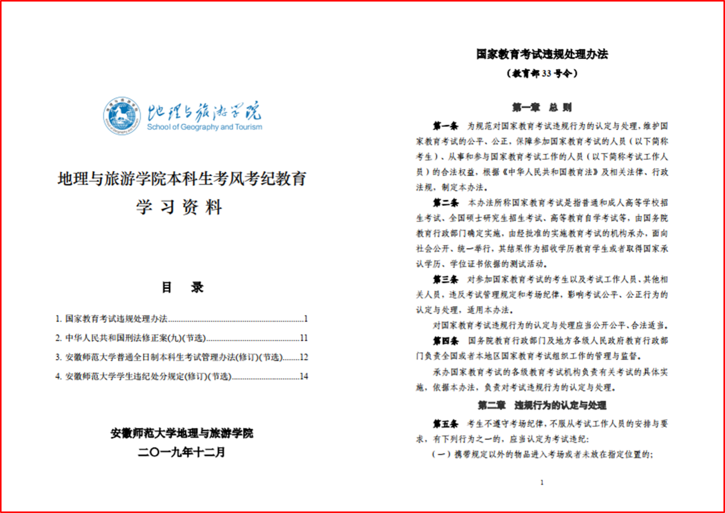 编订学习资料,宣传法律规定。为进一步提高学生对考风考纪相关法律法规的认识和了解,学院安排专人整理国家教育考试违规处理办法、安徽师范大学学生违纪处分规定(修订)等法律规定,编订了考风考纪教育学习资料,组织学生认真学习,提高思想认识。