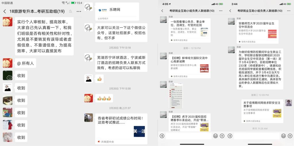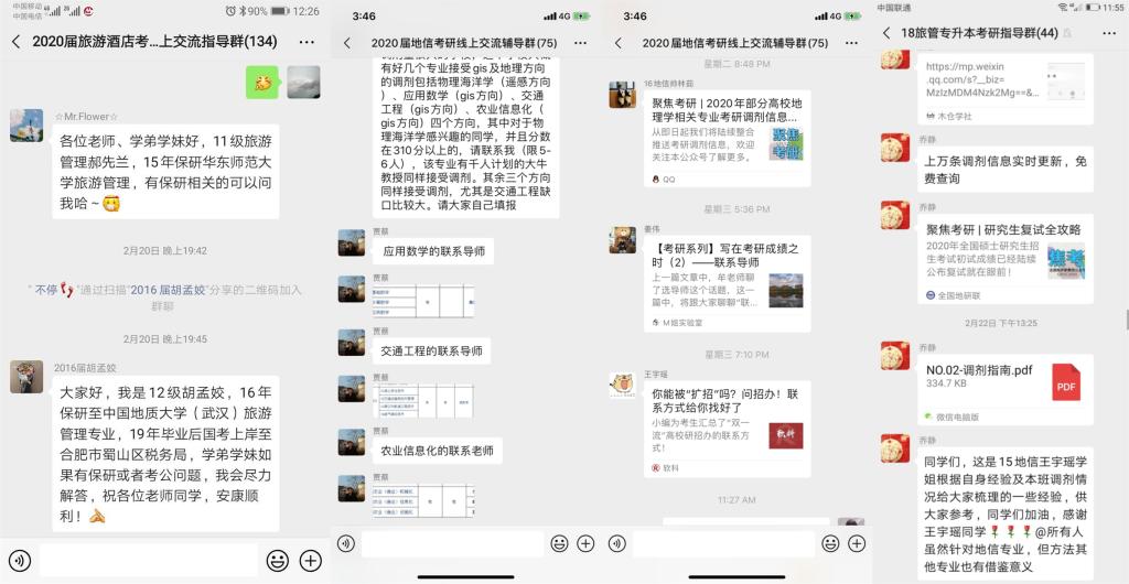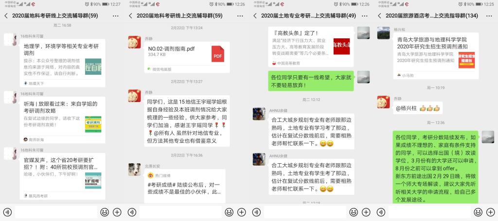 2月16日,各专业分别建立考研复试调剂线上交流辅导群,邀请学院领导、各专业负责人、专业教师、优秀校友等进群与考研学生进行线上交流,为考研学生复试、调剂答疑解惑,提供宝贵建议。全院各专业在班子成员、专业负责人和广大教师的积极参与下,针对复试中的专业备考要点、面试注意事项和调剂方法策略等耐心细致给予学生指导解答,发挥各自资源专长主动为学子提供“一对一”精准帮扶,如:地理信息科学专业程先富教授、城乡规划专业姚景艳老师等定期给学生发布复试调剂信息,地理科学专业吴立教授、地理信息科学专业贾蔡老师等主动发挥人脉资源积极向兰州大学、西北大学、合肥工业大学等高校推荐考生。学院往届优秀考研学子在总结自身考研、调剂经历的基础上,撰写考研复试感悟为母院学弟学妹做经验分享,充分发挥校友资源在促进考研中的有效作用。