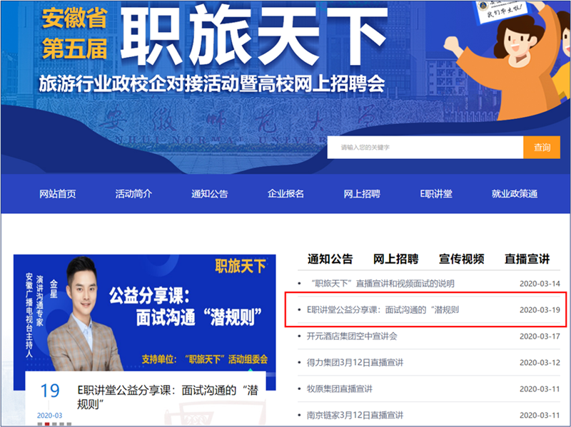 陈祥云)为帮助毕业生更好地掌握求职面试技巧,进一步提高毕业生求职面试成功率,切实做好疫情防控期间毕业生就业指导服务工作,3月21日下午3点-4点30分,安徽省第五届“职旅天下”网上招聘会系列活动之E职讲堂公益分享课在腾讯会议线上平台举行,安徽卫视主持人金星应邀为高校学子在线讲授《面试沟通的“潜规则”》,竞彩网