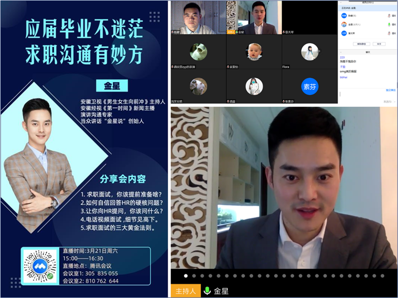 金星为安徽卫视《男生女生向前冲》主持人,安徽经视《第一时间》新闻主播,演讲沟通专家,当众讲话“金星说”创始人。本次的公益分享直播课,金星从求职面试该提前准备什么;如何自信回答HR的硬核问题;如何向HR提问;电话视频面试需注意哪些细节;求职面试的三大黄金法则等五个方面,为同学们详细介绍求职面试的相关技巧。