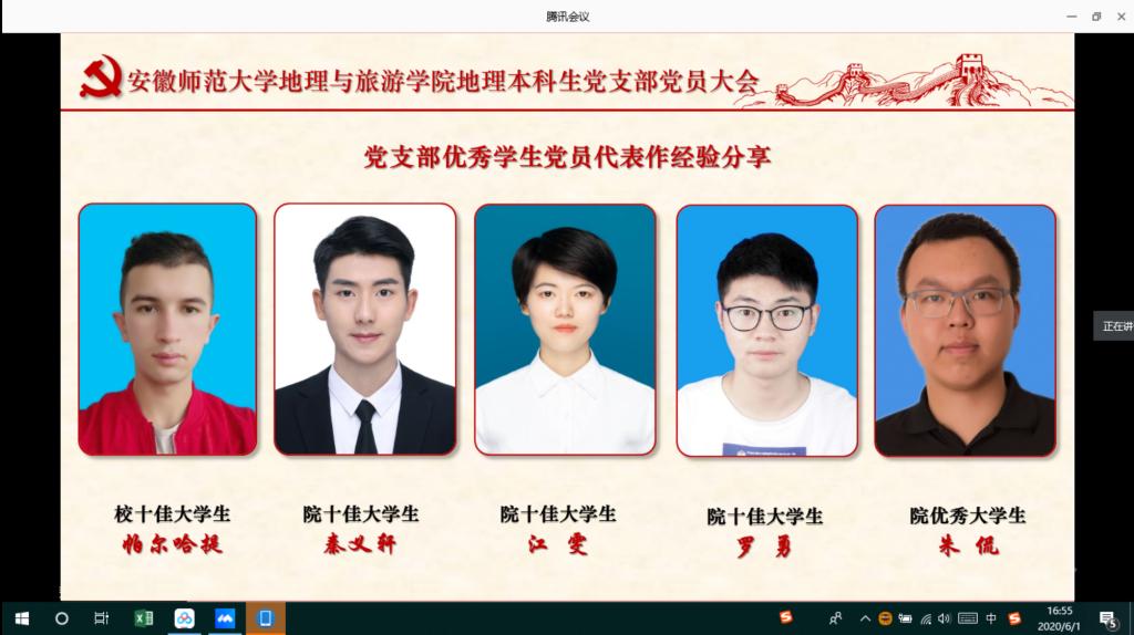 随后,近期党支部在专业学习、科研创新、学生工作、志愿服务等方面涌现出来的优秀学生党员代表作经验分享。校十佳大学生怕尔哈提·图尔荪,院十佳大学生秦义轩、江雯、罗勇,院优秀大学生朱侃等5名同志,一一分享了自己在师大学习期间追寻理想、坚定信仰、投身科研、服务社会的感人事迹,并鼓励其他同志不忘初心、牢记使命、永远奋斗,争做一名优秀的大学生党员。