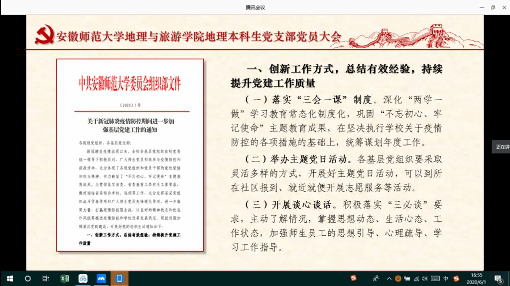 齐小学)5月28日晚,地理本科生党支部利用腾讯会议网络平台召开党员大会,传达学校重要文件精神,贯彻落实学校党建工作重要要求,扎实推进标准化规范化建设。党支部全体成员参加会议。会议由党支部书记齐小学主持。