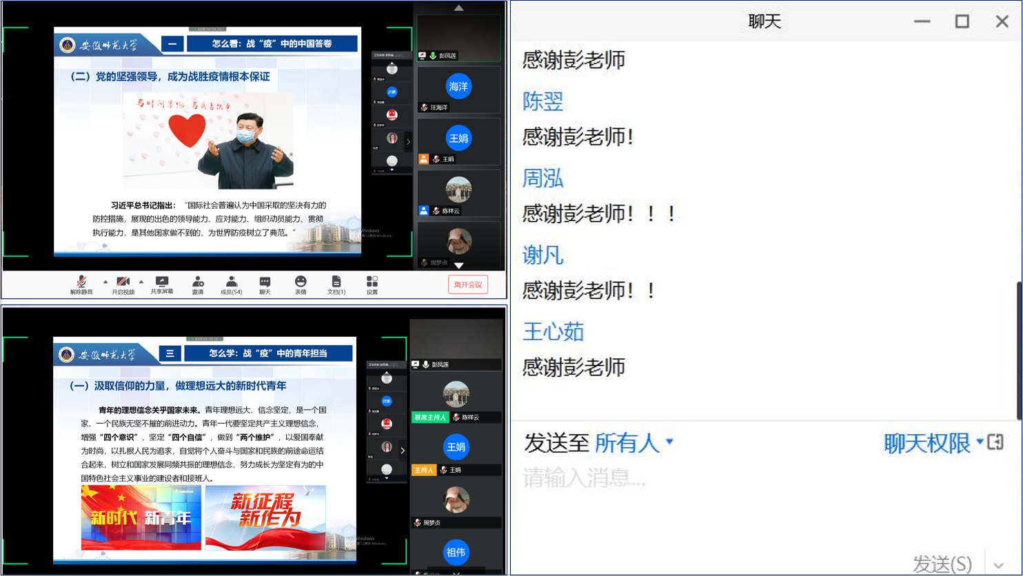2018级旅游管理专业本科生线上讲授题为《战“疫”中的中国之治与青年学子责任担当》的专题形势与政策课。