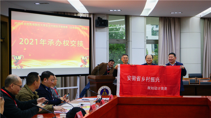 党委书记贾冠忠、安徽省高等学校土木建筑类专业合作委员会秘书长储金龙教授和2021年度大赛承办单位代表安徽科技学院建筑学院院长张远兵教授共同举行交接仪式。评优会结束后还举行了安徽省高等学校城乡规划专业教学研讨会,来自省内高校城乡规划专业负责人就专业人才培养、一流专业建设等议题进行了交流研讨。