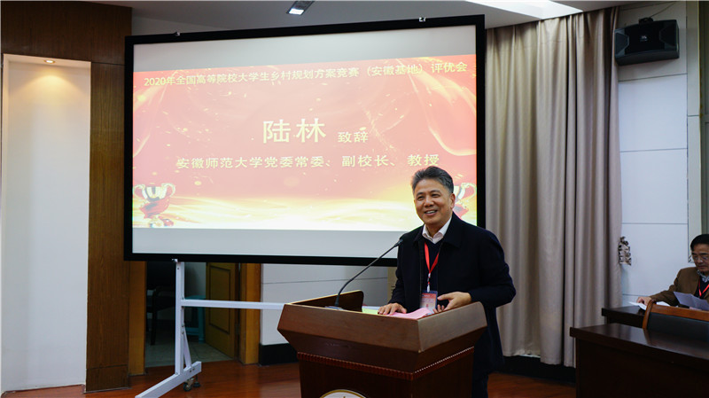 党委书记贾冠忠,安徽师范大学教务处副处长李汪根,评委专家组成员以及合肥工业大学、安徽师范大学、安徽建筑大学、安徽农业大学、黄山学院、安徽科技学院等省内高校城乡规划专业负责人和教师代表现场参加评优会,参加安徽基地乡村规划方案竞赛的全国31所高校的老师和同学在线上参加评优会。