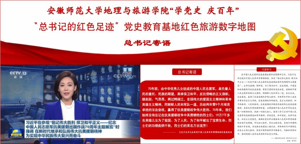 创新研发的“总书记的红色足迹”党史教育基地红色旅游数字地图这个平台,开展了党史学习教育沉浸体验式学习。该项目在学校党委宣传部、马克思主义学院等单位的指导下,自2021年4月初启动,历时2个多月,院党委组织党员教师、学生和相关制作单位近百人参与开发创作,围绕党的十八大以来习近平亲自到访考察过的24个红色党史教育基地,收集整理史实及相关图文资料、视频素材36G,撰写红色讲解词8万余字,录制红色讲解宣传片24个,时长240余分钟,并结合GIS等技术自主研发搭建系统平台,以CSS3、HTML5以及ECMAScript 6版规则的Javascript语言构建模块化结构前端网页,开发制作了可在PC端、移动端同时使用,集数字地图漫游、红色基地导览、总书记寄语学习、雷锋导游在线影音讲解、VR数字三维实景参观、卫星交通导航等功能于一体的智慧“云地图”。