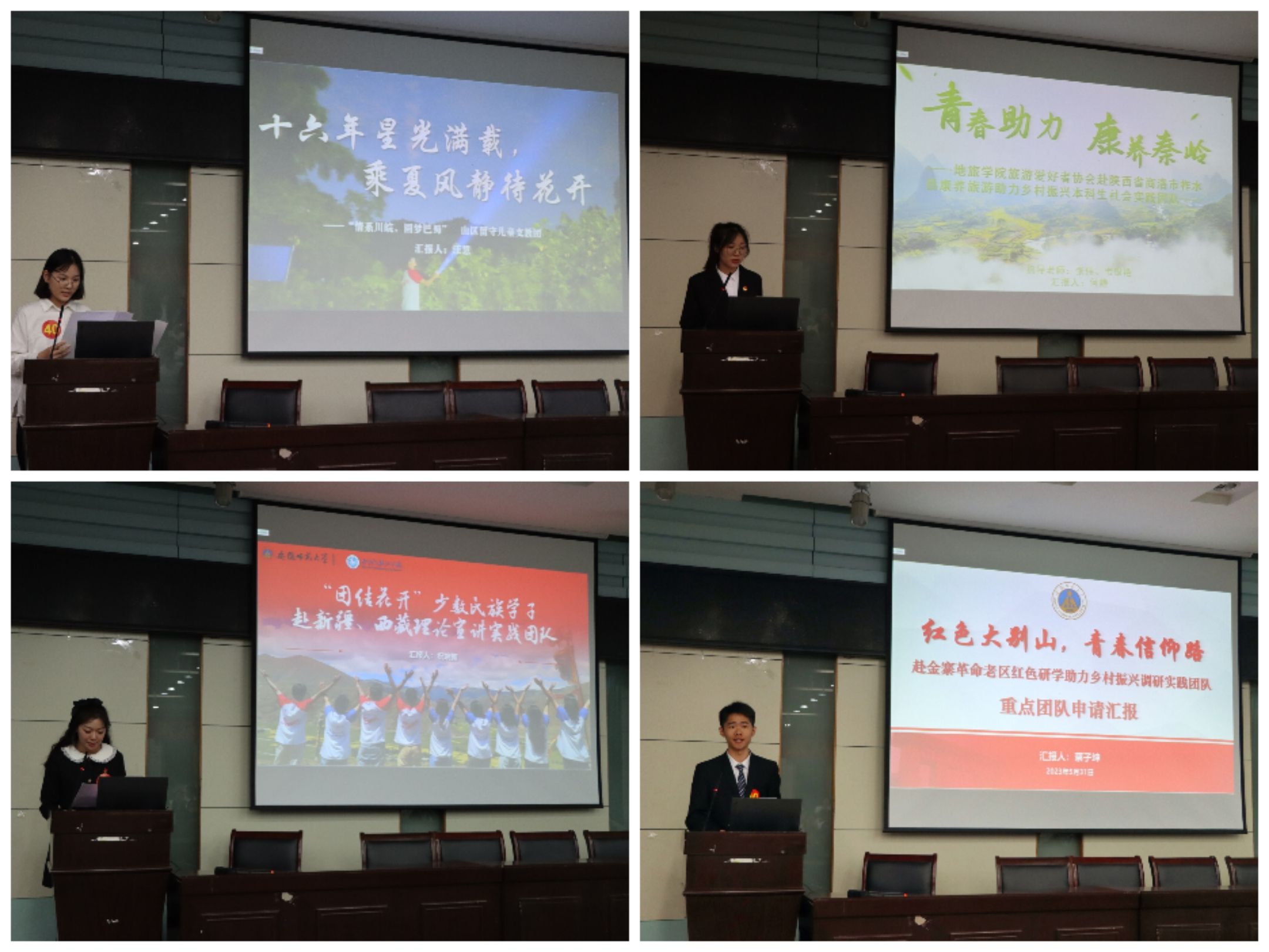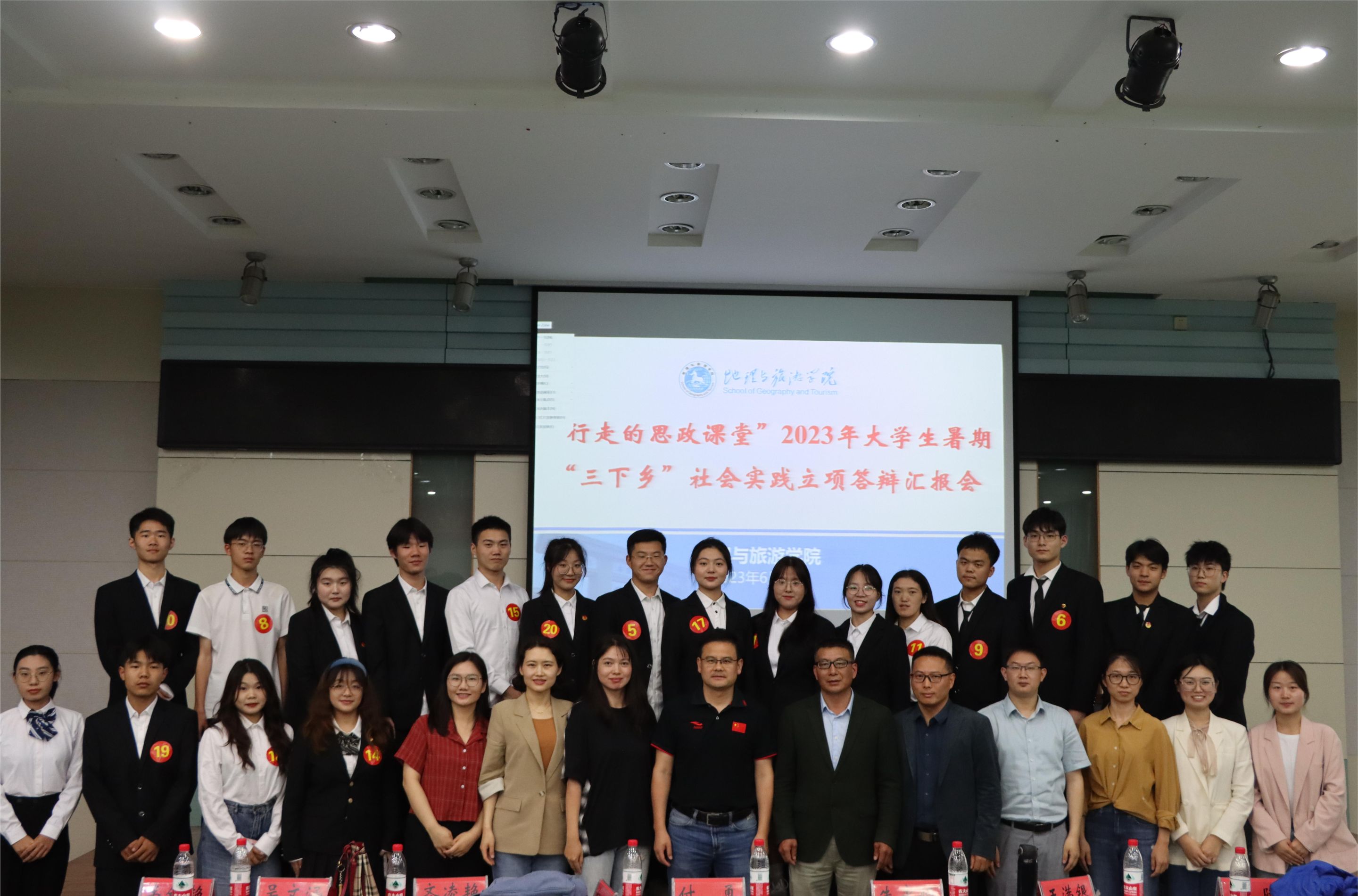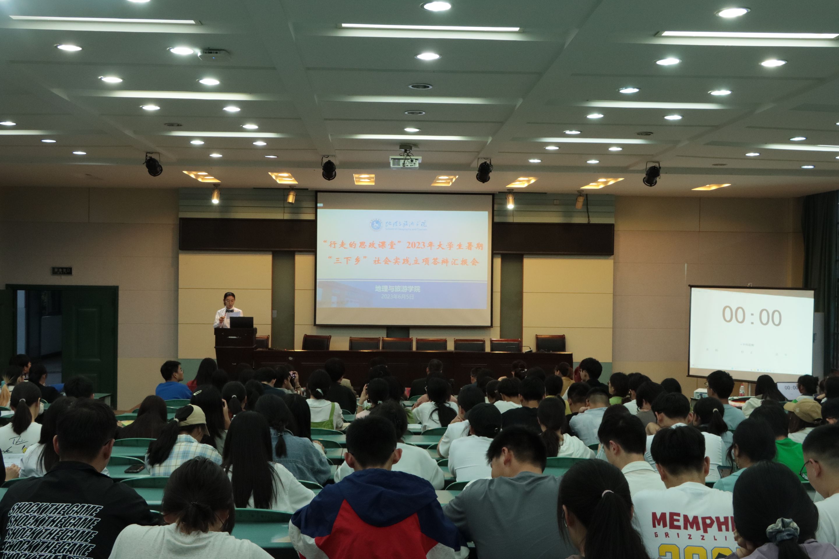 于6月5日在学院报告厅举行“行走的思政课”2023年大学生暑期“三下乡”社会实践立项答辩汇报会。学院党委副书记付勇、地理科学专业负责人朱永恒、旅游管理教师阮陵、地理信息科学教师齐凌艳、土地资源管理教师王满银、城乡规划教师白雪等老师担任评委,团委负责人、辅导员代表以及各团队代表参加会议。