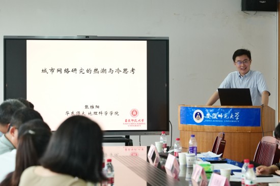 的概况,并向出席本次学术论坛的各位专家学者表示热烈欢迎。在随后的专家报告环节,范斐教授做了主题为《创新地理学的理论方法与研究进展》的报告,旨在探究创新地理学的发展现状,并对创新地理学未来发展进行思考。毛熙彦副教授做了主题为《多尺度视角下的环境产品贸易地理格局演变及其效应》的报告以对环境产品贸易地理格局进行探究。叶玉瑶研究员则从学科发展角度做了《数字化时代人文地理学的新命题》的报告,对人文地理学在数字化时代的发展可能进行了探究。张维阳副教授则对城市网络研究现状进行了反思,并做了《城市网络研究的热潮与冷思考》的报告。