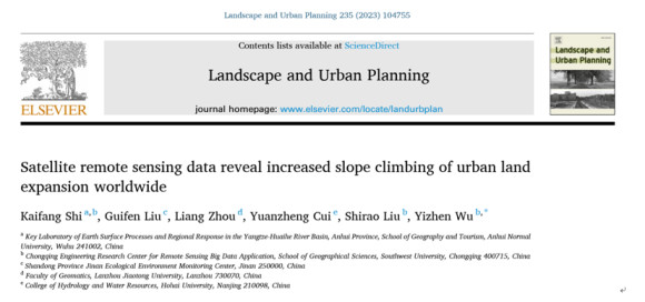 施开放副教授研究小组联合西南大学、兰州交通大学、河海大学等多家科研单位在城市研究领域旗舰型期刊《Landscape and Urban Planning》(SSCI/SCI双检索,城市研究领域排名第一,中科院一区Top,IF=8.119)发表题为Satellite remote sensing data reveal increased slope climbing of urban land expansion worldwide的研究论文。施开放为论文的第一作者,安徽师范大学为论文的第一完成单位。