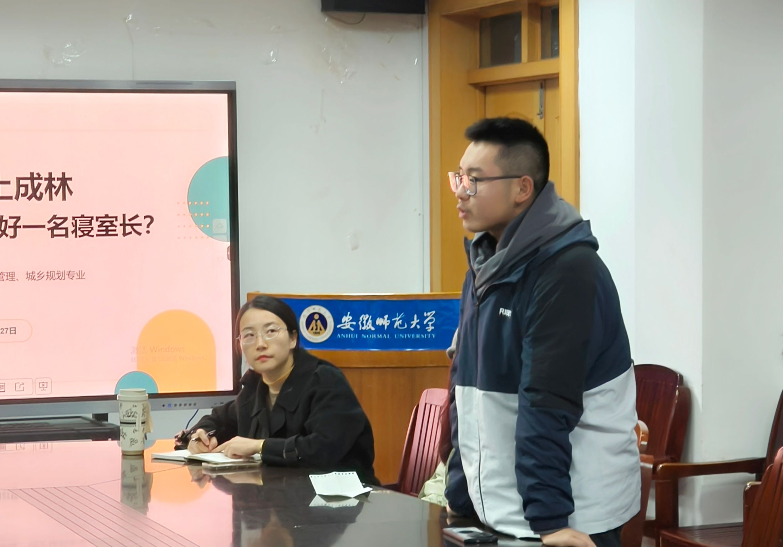 于11月27日在行政楼三楼会议室组织召开了以“向下扎根,向上成林——如何做好一名寝室长”为主题的寝室长会议。本次会议由辅导员彭媛媛担任主讲人,地理科学(师范)、土地资源管理与城乡规划专业全体寝室长参与此次会议。