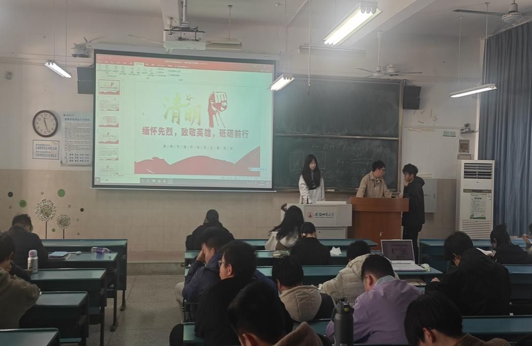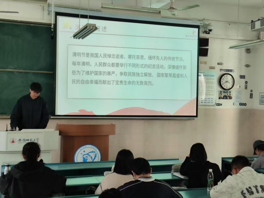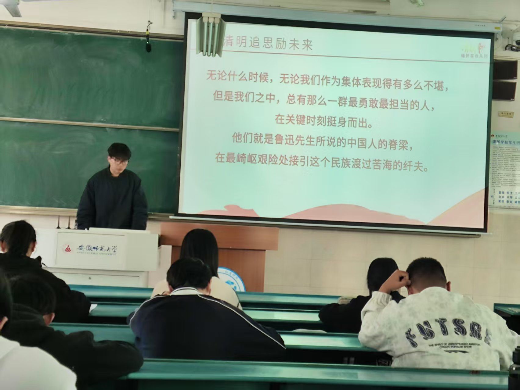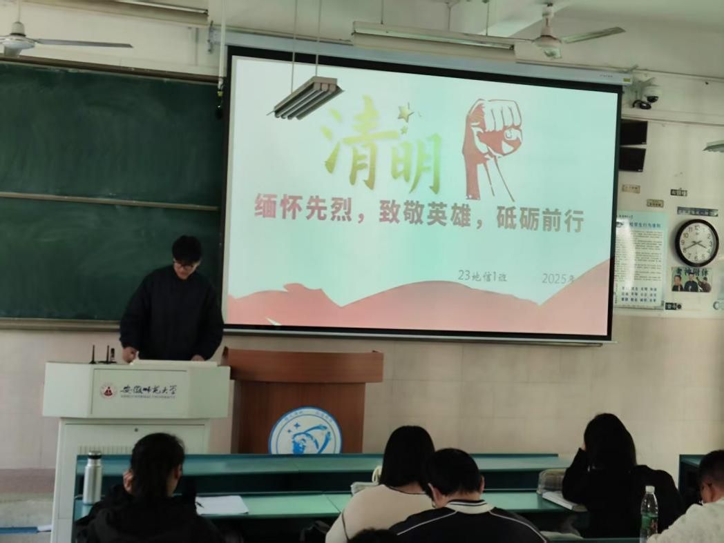 (本稿讯 朱睿文 殷思远)清明节前夕,安徽师范大学2023级地理信息科学专业两班级在教学楼2040303教室举办了两场意义非凡的清明主题班会。此次班会以“缅怀先烈,致敬英雄,砥砺前行”为主题,旨在让同学们铭记历史,传承先烈们的爱国精神,珍惜当下幸福生活。