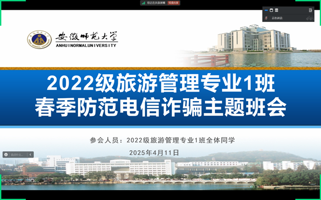 为增强学生反诈意识,筑牢校园安全防线,2022级旅游管理专业1班全体同学在4月11日下午于线上开展“春季防范电信诈骗”主题班会。
