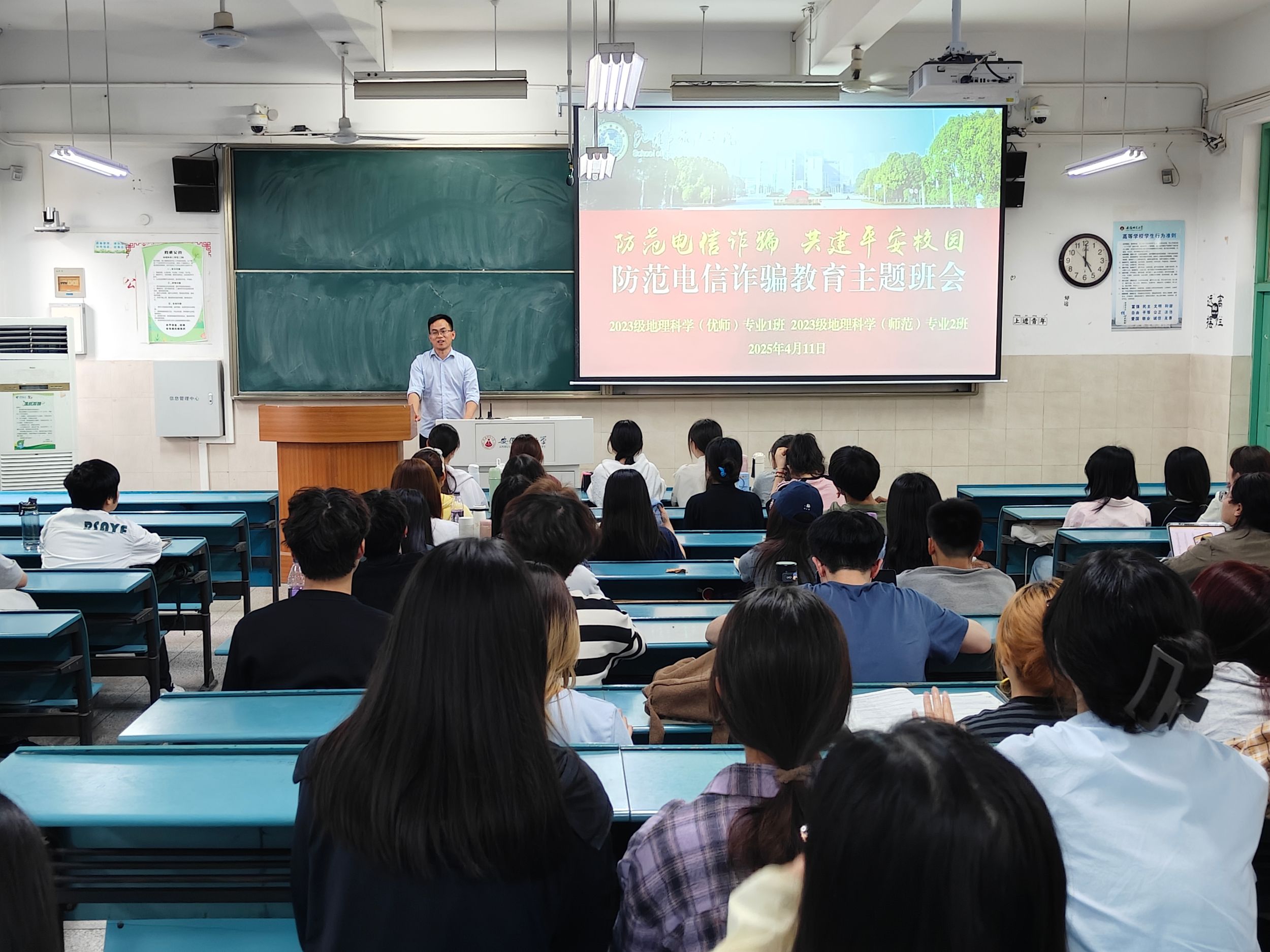 4月11日下午,2023级地理科学(师范)专业2班在行政楼2040204教室召开“防范电信诈骗 共建平安校园”防范电信诈骗教育主题班会,2023级地理科学(师范)专业2班全体同学参加会议。会议由辅导员齐小学主持。