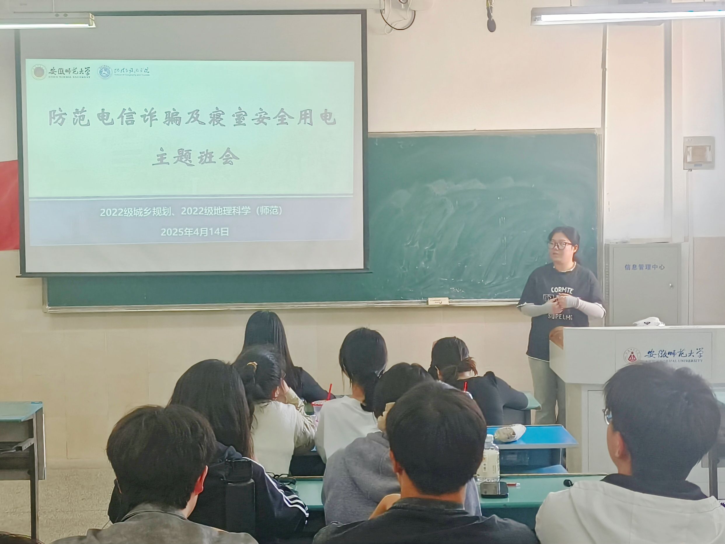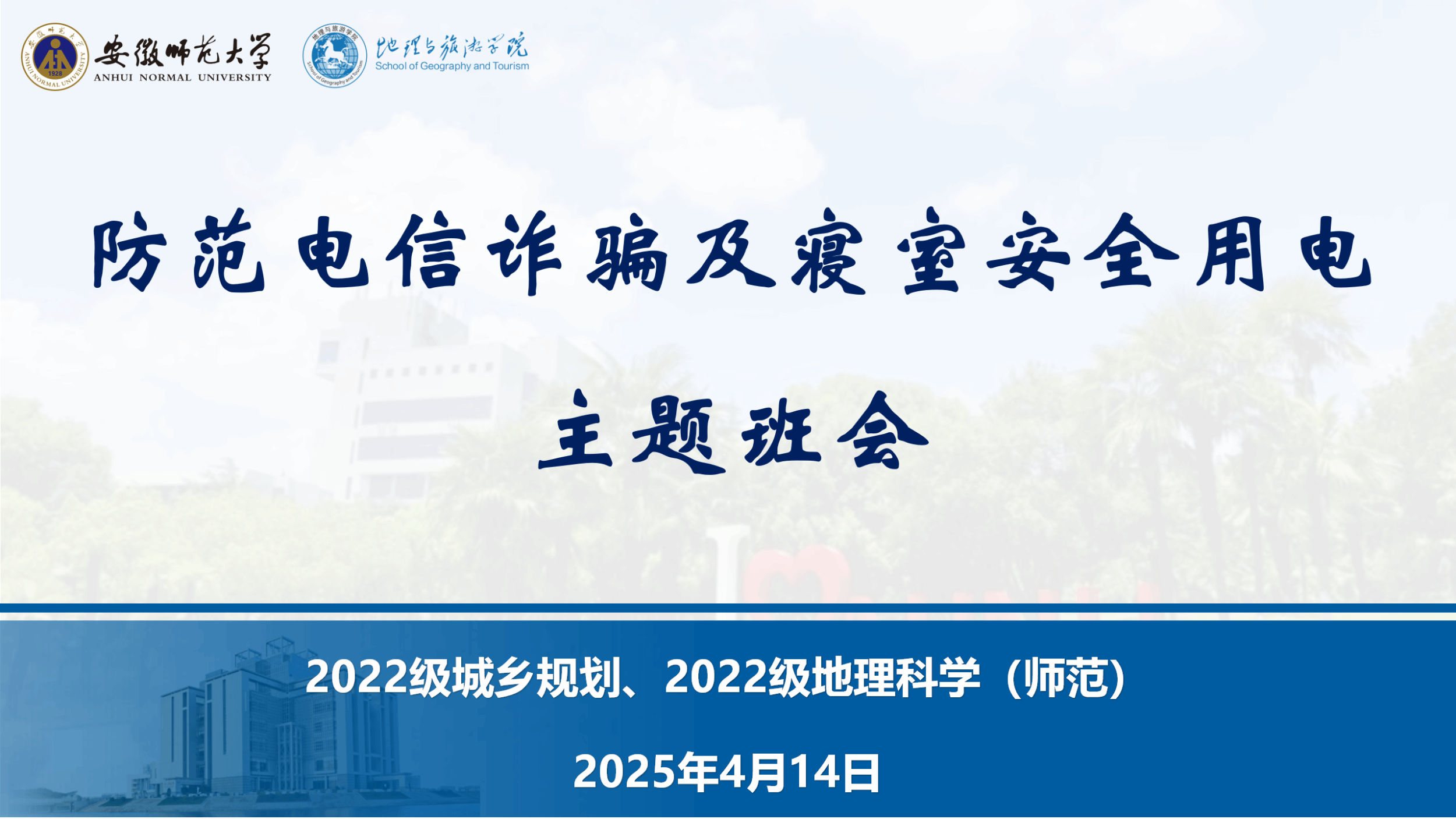 “大学生护航”行动计划,进一步增强学生防范电信诈骗的意识,加强寝室安全用电教育,提升同学们的安全防范意识,2025年4月14日,2022级城乡规划专业1班在行知楼2040401A召开防范电信诈骗及寝室安全用电主题班会,2022级城乡规划专业1班全体同学参加。班会由团支书王冰冰主持。
