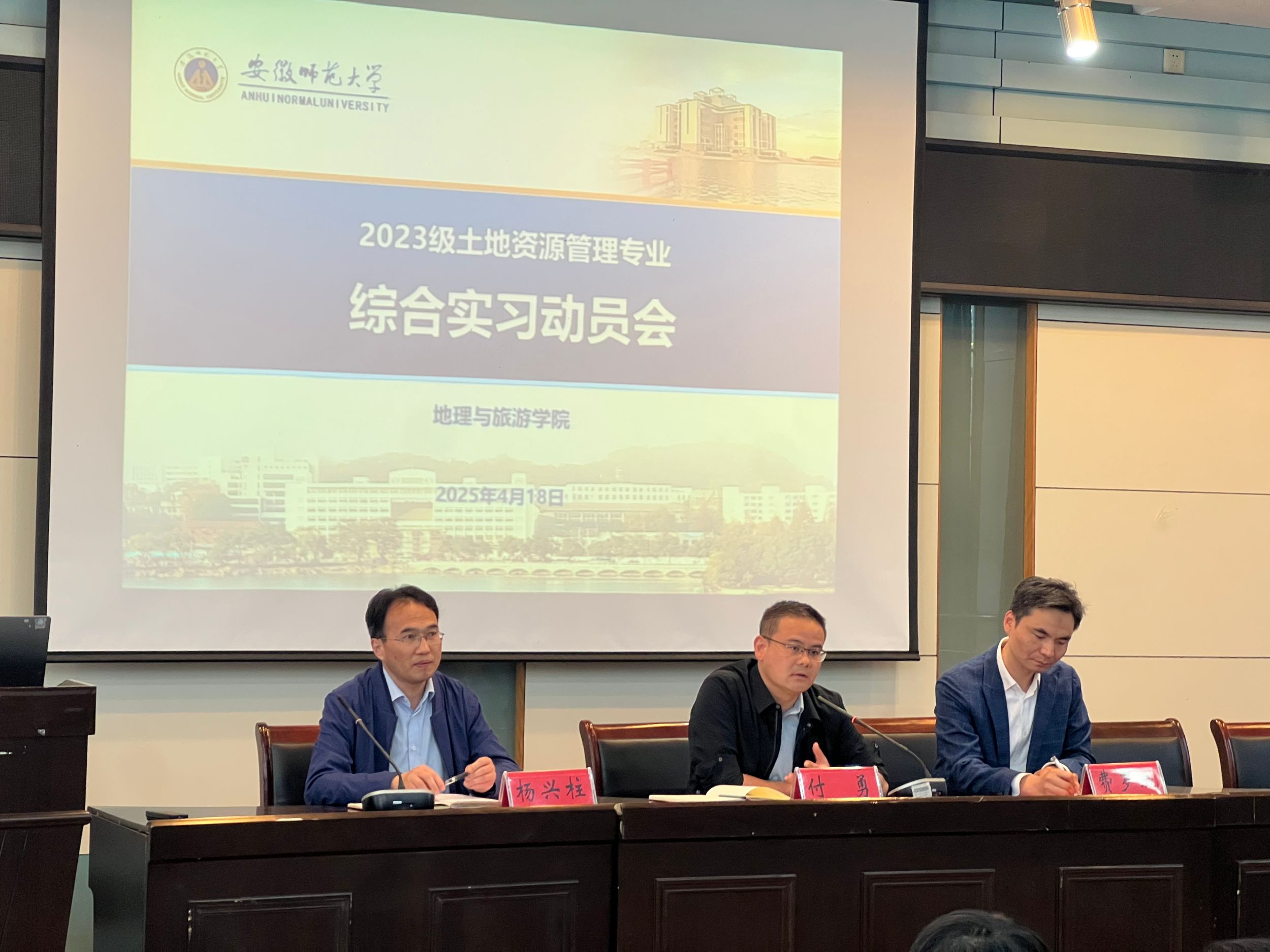实验楼101报告厅内,2023级土地资源管理专业综合实习动员会隆重举行。本次专业综合实习为期8周,采用"校内实验+校外调研"的创新模式,旨在全面提升学生的专业实践能力和职业素养。学院党委副书记付勇、副院长杨兴柱、专业负责人费罗成及实习指导老师们出席会议,2023级土地资源管理专业全体学生参加。