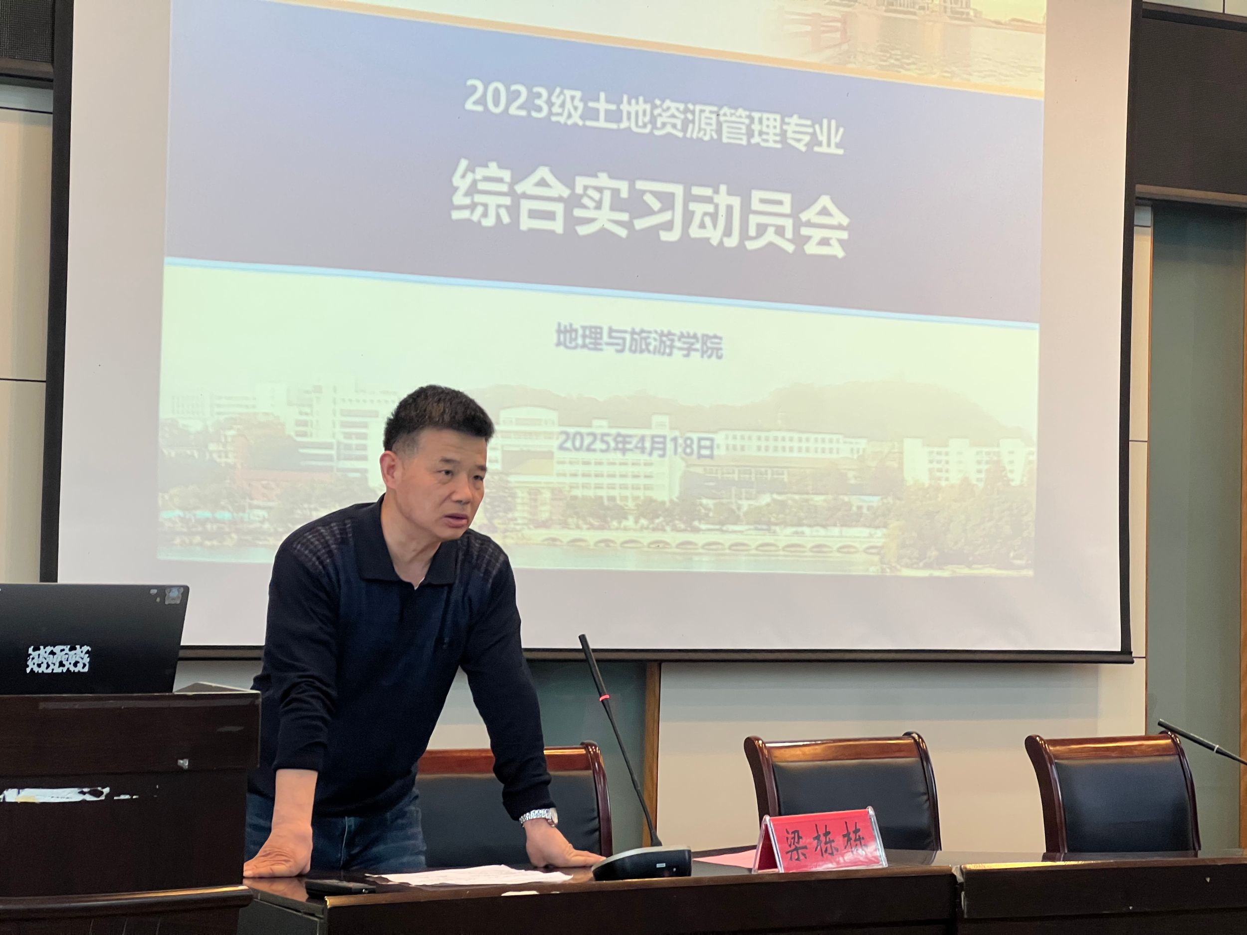 在实习部署环节,实习组长梁栋栋老师系统介绍了实习的整体安排,包括时间节点、地点分布、分组方案、考核标准等具体事项。随后,指导老师王满银、李陈、沈非、董婷分别就所负责模块的教学内容、考核方式及注意事项进行了详细说明。老师们特别叮嘱野外调研条件相对艰苦,同学们要做好充分准备,始终把安全放在第一位。
