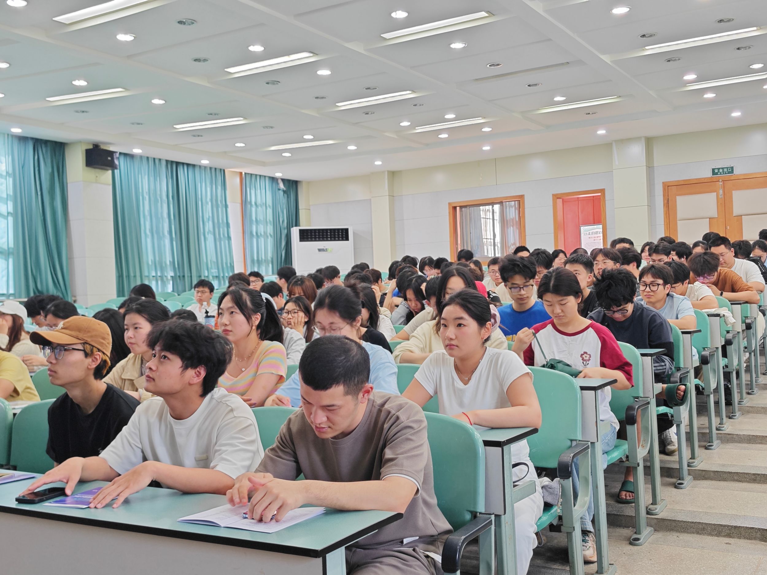 在实验楼101报告厅召开第九期“学·思·享”大讲堂暨2026届考研留学讲座。本次讲座邀请新东方国际教育讲师团讲师奚哲现场讲解考研、留学相关资讯,2026届城乡规划、土地资源管理、旅游管理等专业同学参与。