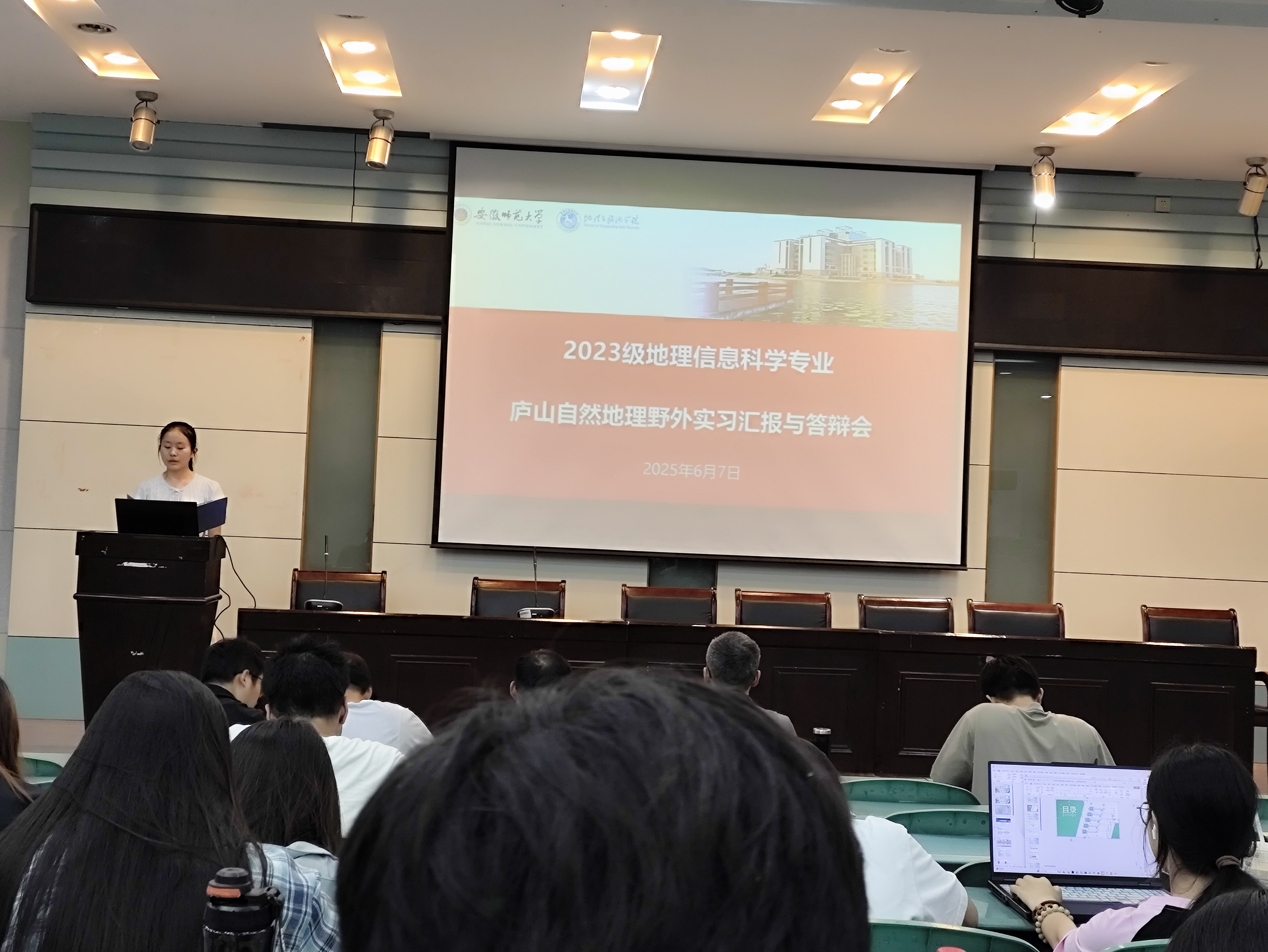 (本稿讯 唐丹丹)2025年6月7日下午,2023地理信息科学专业在实验楼101报告厅举行自然地理野外实习总结汇报会。本次实习为期八天,六个小组围绕庐山地理概况、地质地貌、水文、气象与气候、植物、土壤等要素展开系统调研,通过实地调差结果展示、案例分析与实践感悟分享,呈现了一场兼具学术性与实践性的成果汇报。