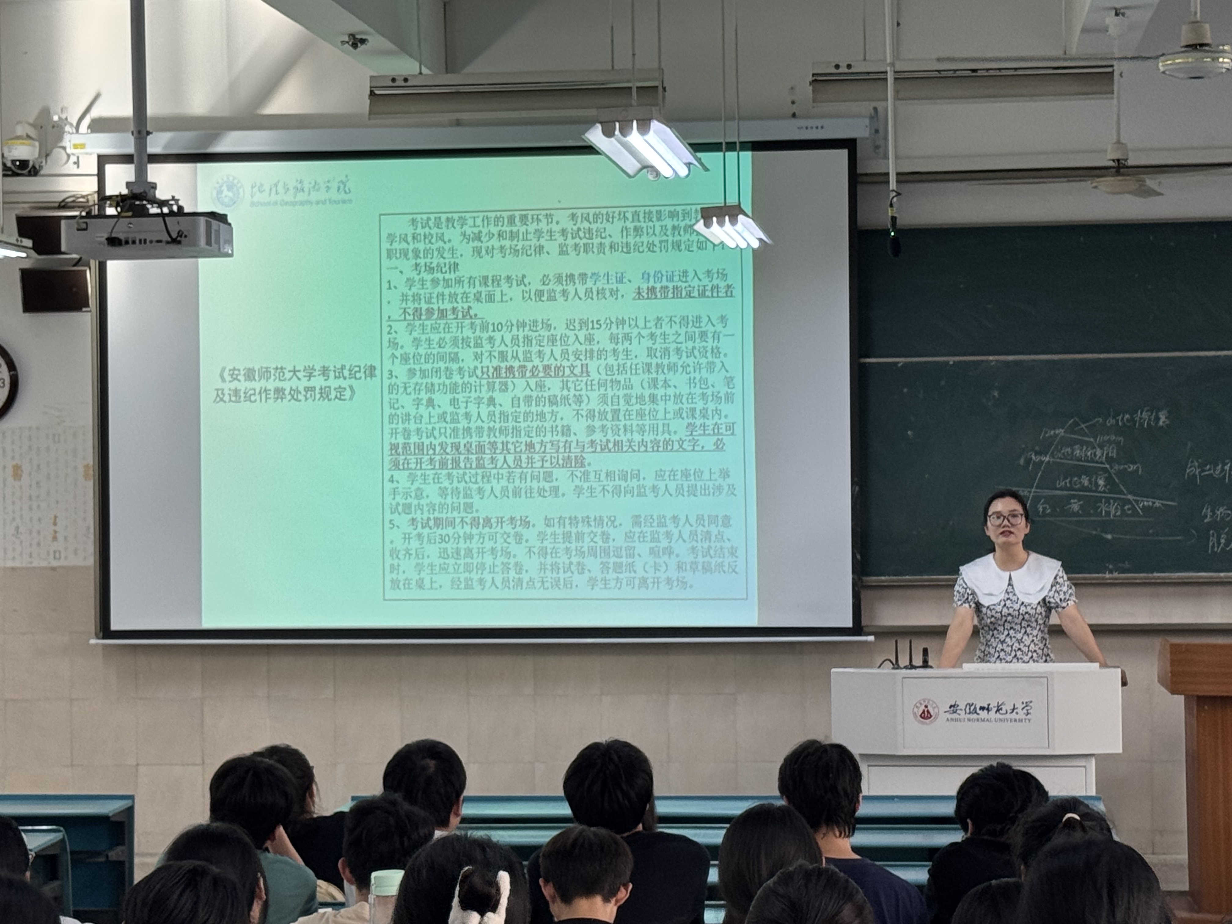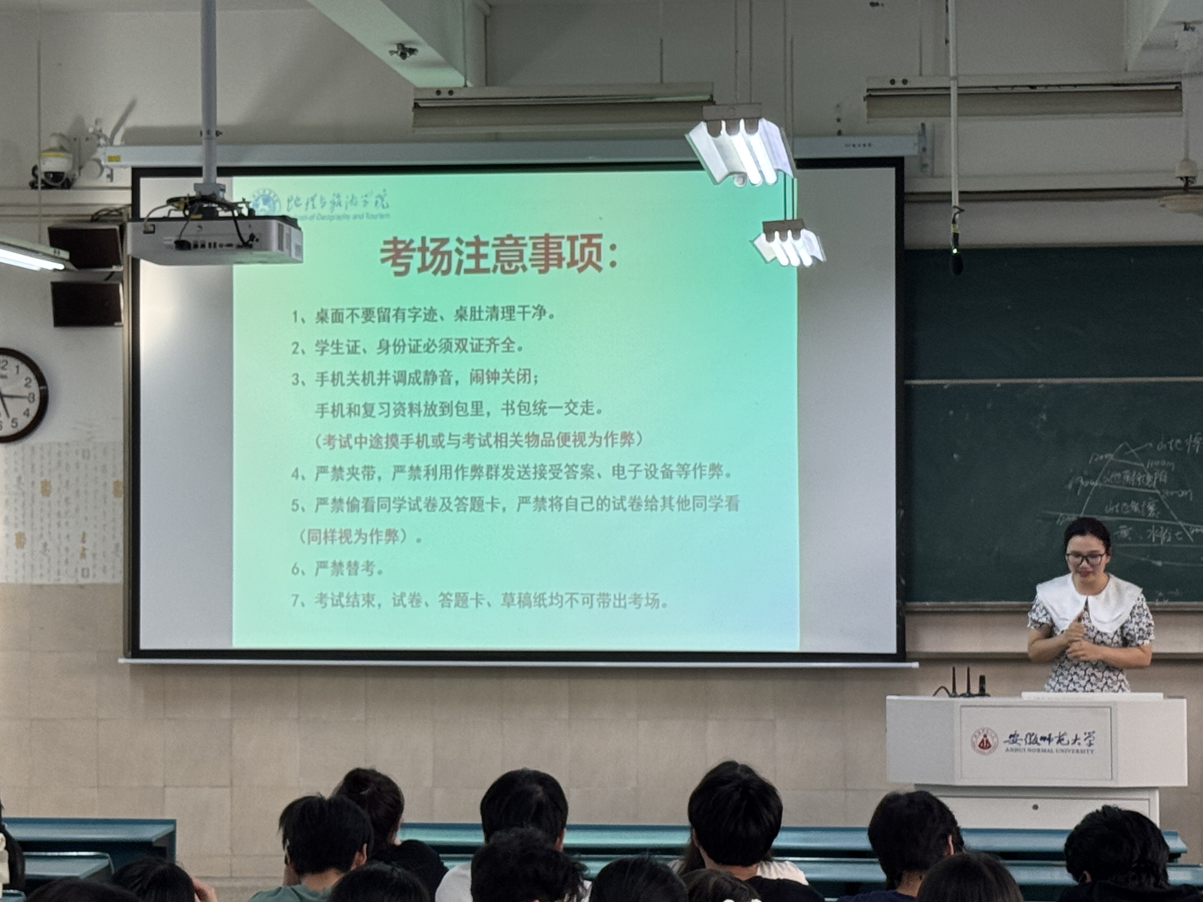 班会伊始,韦银艳重点强调了诚信应考的重要性与严肃性。她带领全体同学认真学习了《安徽师范大学学生违纪处分规定》中关于考试违纪和作弊行为的认定标准及相应处分条款,明确指出任何形式的学术不端行为均属不可触碰的“高压线”。同时结合案例深刻剖析了考试作弊对个人学业发展、声誉信誉造成的“不可逆损害”,警示同学们务必摒弃侥幸心理,自觉维护学术纯洁和考试公平。全体同学在王老师带领下进行了庄严的诚信考试宣誓,并在《诚信考试承诺书》上郑重签名,表达了恪守学术道德、以真实水平迎接检验的坚定决心。