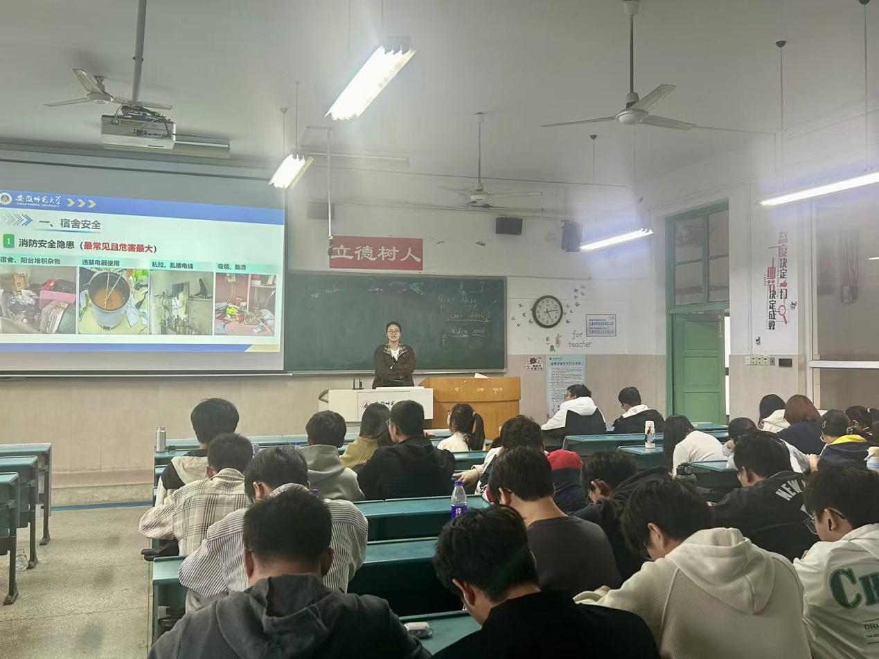 在宿舍安全环节,吴楠通过播放寝室电路故障引发火灾的案例视频,以触目惊心的画面让同学们深刻认识到违规用电、使用明火的严重危害。她明确提出宿舍安全“四做到”:做到安全用电,不用违规电器,人走电断;做到卫生有序,不用明火(吸烟),不堆杂物;做到出入锁门,钥匙随身,贵重物品入柜落锁;做到拒留外人,谢绝推销。同时,倡导同学们互查“睡前三关”(关电、关窗、关闸心),将安全细节融入日常生活。