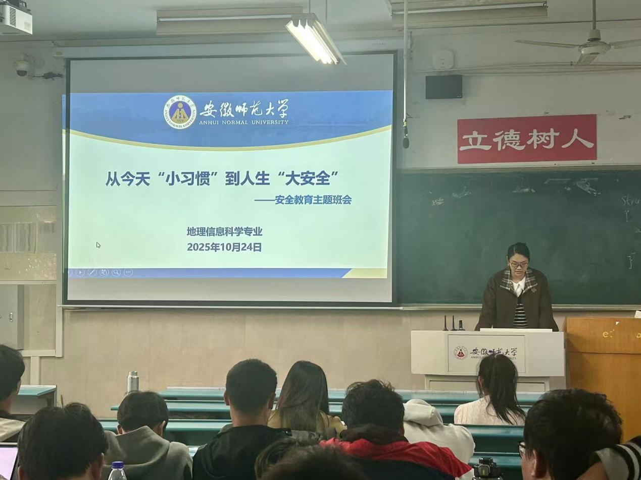 2023级地理信息科学专业于行知楼2030501教室召开了以“从今天‘小习惯’到人生‘大安全’”为主题的安全教育班会。班会由辅导员吴楠主持,2023级地理信息科学专业全体同学参加。班会现场,吴楠以“案例+知识+互动”的形式,围绕宿舍安全、文明交通与反电信网络诈骗等核心板块展开讲解。