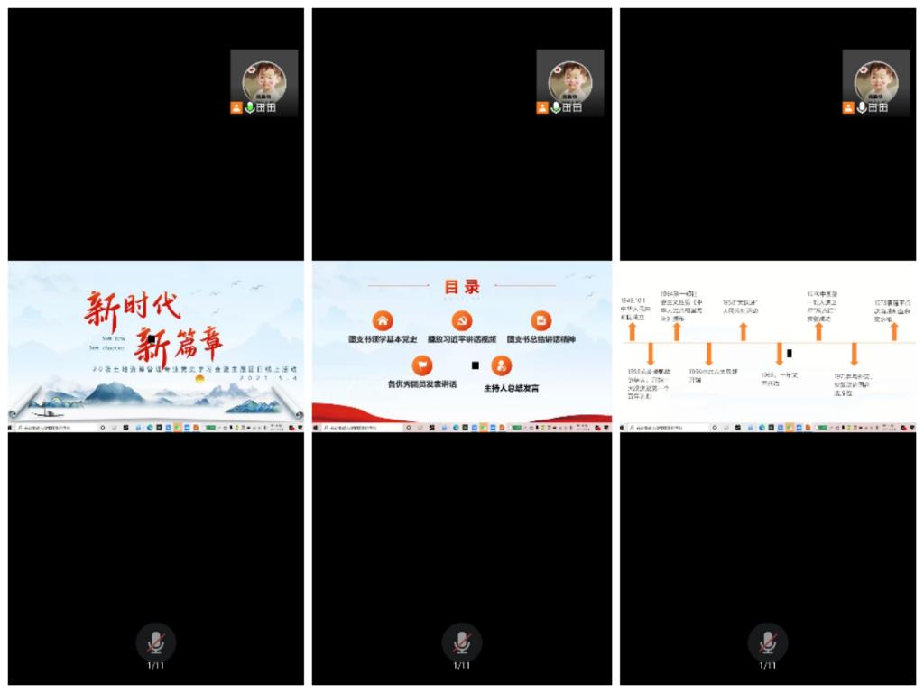 首先,团支书刘嘉瑶带领大家学习《中国共产党简史》,并播放了习近平总书记重要讲话视频,视频播放结束后,团支书刘嘉瑶率先分享自己的学习感受和收获:习近平总书记指出,当代中国青年是与新时代同向同行、共同前进的一代,生逢盛世,肩负重任。百年接续,奋斗有我。我们要在自己的学科领域中脚踏实地、实学实干,担起青年一代的责任使命。接着,团支部优秀团员代表分享学习后的感悟。杨松宁说到:2021年是中国共产党成立100周年,百年沉淀,历久弥新。在五四青年节这个特殊的历史时期,我们团员学习党史具有特殊意义,能够从党的百年峥嵘中汲取力量,不忘初心,砥砺前行。桂鑫晨说到:我们深信,经受风雨砥砺的中国共产党一定能够肩负历史重任,不负人民重托,书写新时代新的荣光。在讲述“我不想成为什么样的人”这一环节,各位同学积极发言,“我不想成为一个碌碌无为的人,想为这个国家与社会做出贡献”、“我不想成为一个不善良的人”、“我不想成为一个不勇敢的人”……