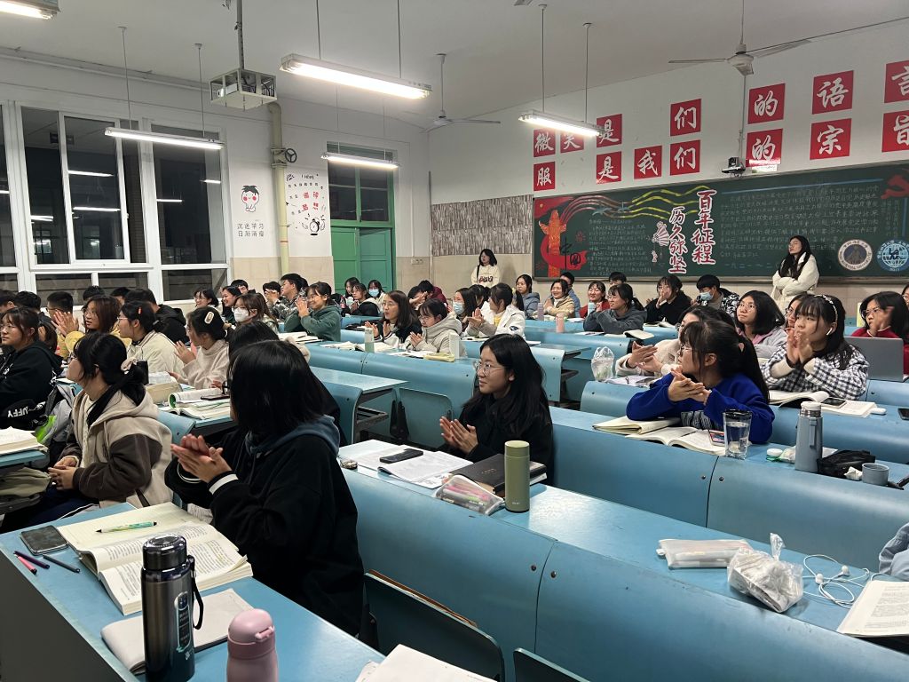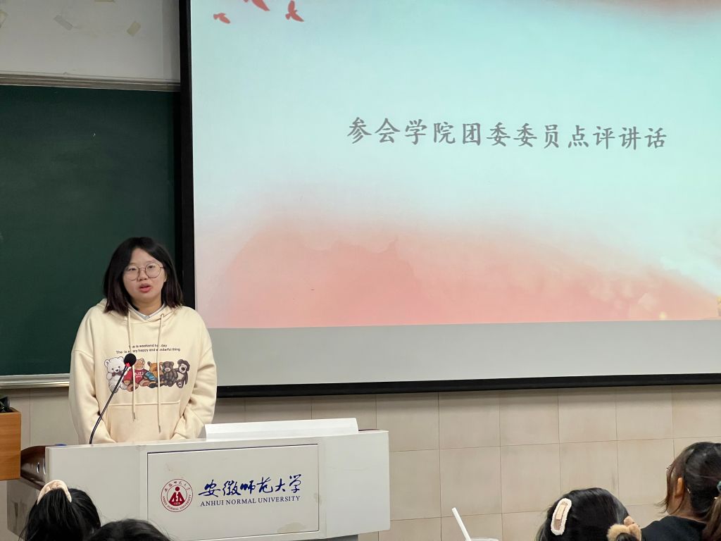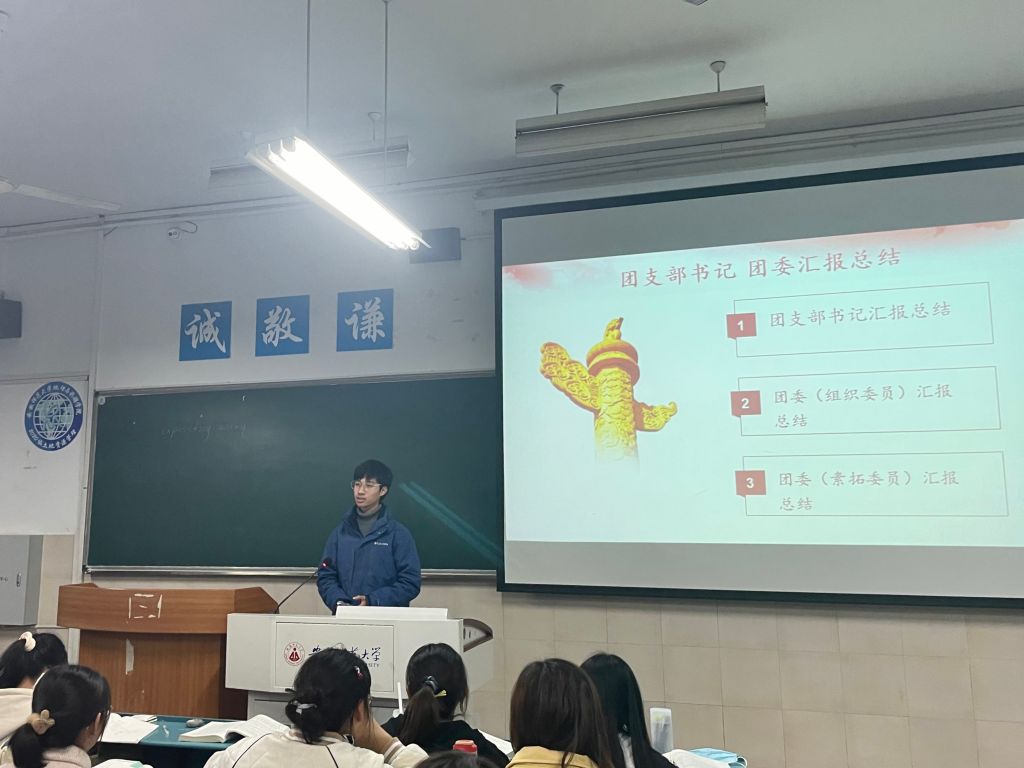 大会由四项议程组成。第一项是齐唱团歌。伴随着慷慨激昂的音乐,全体同学肃然起立,齐唱团歌。待同学们坐下后,第二项团支部委员会做工作汇报总结。团支书黄倩、团委组织委员张悦、团委素质拓展委员侯佳、团委宣传委员陈谊依次站上讲台,就本学期开始以来的各项工作状态进行工作汇报,向同学们展示近期工作进展和成效,并表达竭心尽力为同学服务的初心使命。第三项议程为优秀团员民主评议结果公布。会前经过团委组织,全体团员通过个人自评、团员互评和组织评价相结合的方式开展团员教育评议,最后选出优秀等次、合格等次的团员。大会第四项为参会学院团委委员点评讲话。团委组织委员周咏恬全程参与我支部大会,并提出几点意见,其中包括在唱团歌时部分同学不熟练、团支部大会流程存在问题、团支部内群众数量仍较多等。此后,辅导员韦银艳老师也进行了点评,主要针对院团委委员提出的问题进行批评指正,鼓励青年大学生要牢记时代使命,争做有为青年。